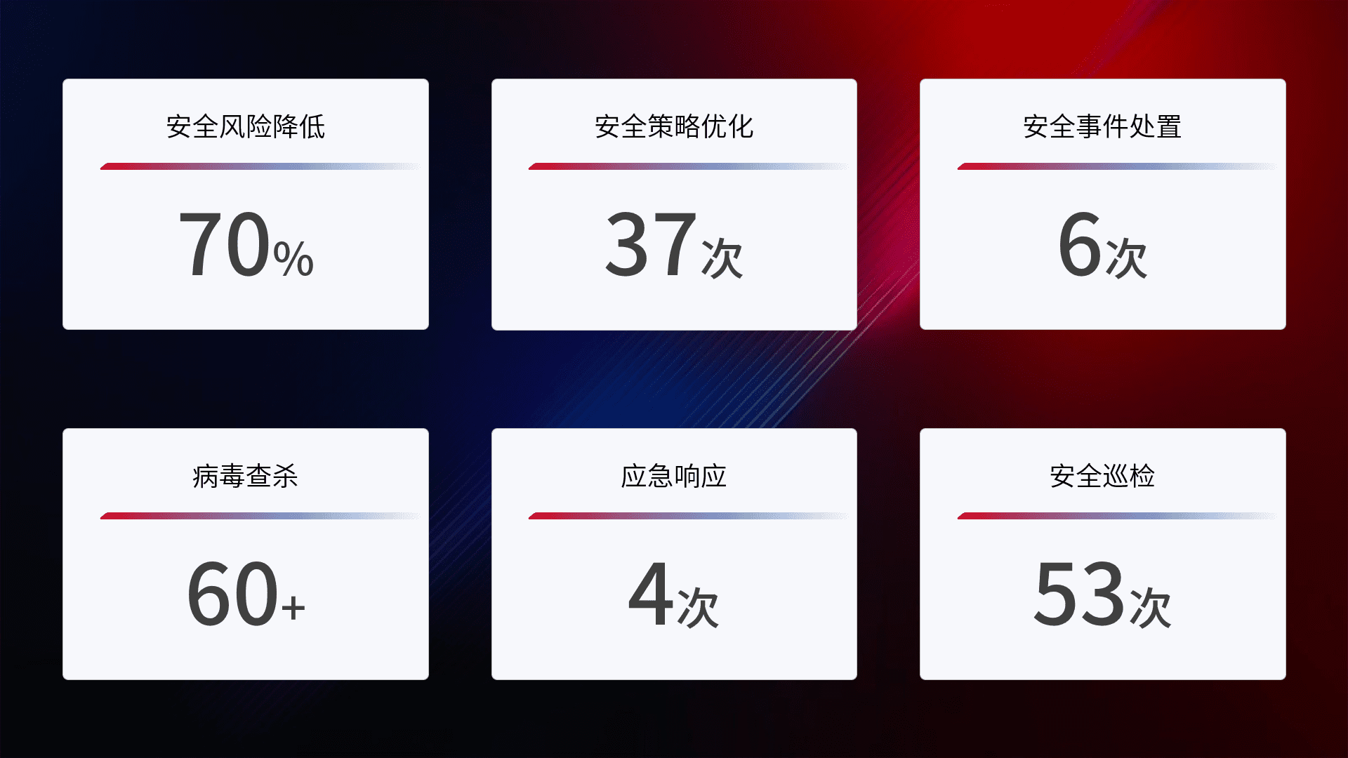 提供全面的安全事件报告体系,,,包括处置报告、、、、周报、、、季度和年度总结,,,,结合持续监控,,,帮助客户深入了解网络安全状况。。