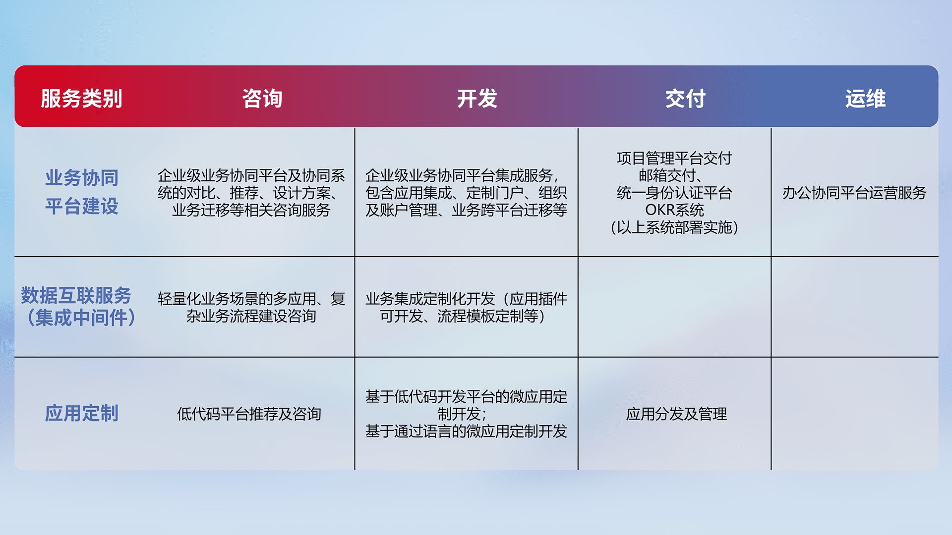 针对钉钉、、、、企微、、、、IDaas等平台级产品提供产品的规划、、方案、、、、交付、、、、定制化开发等服务,,,实现如统一协同办公、、智能客户服务、、、混合会议管理、、、智能数据查询、、等业务场景,,,实现数字化转型。。。。
